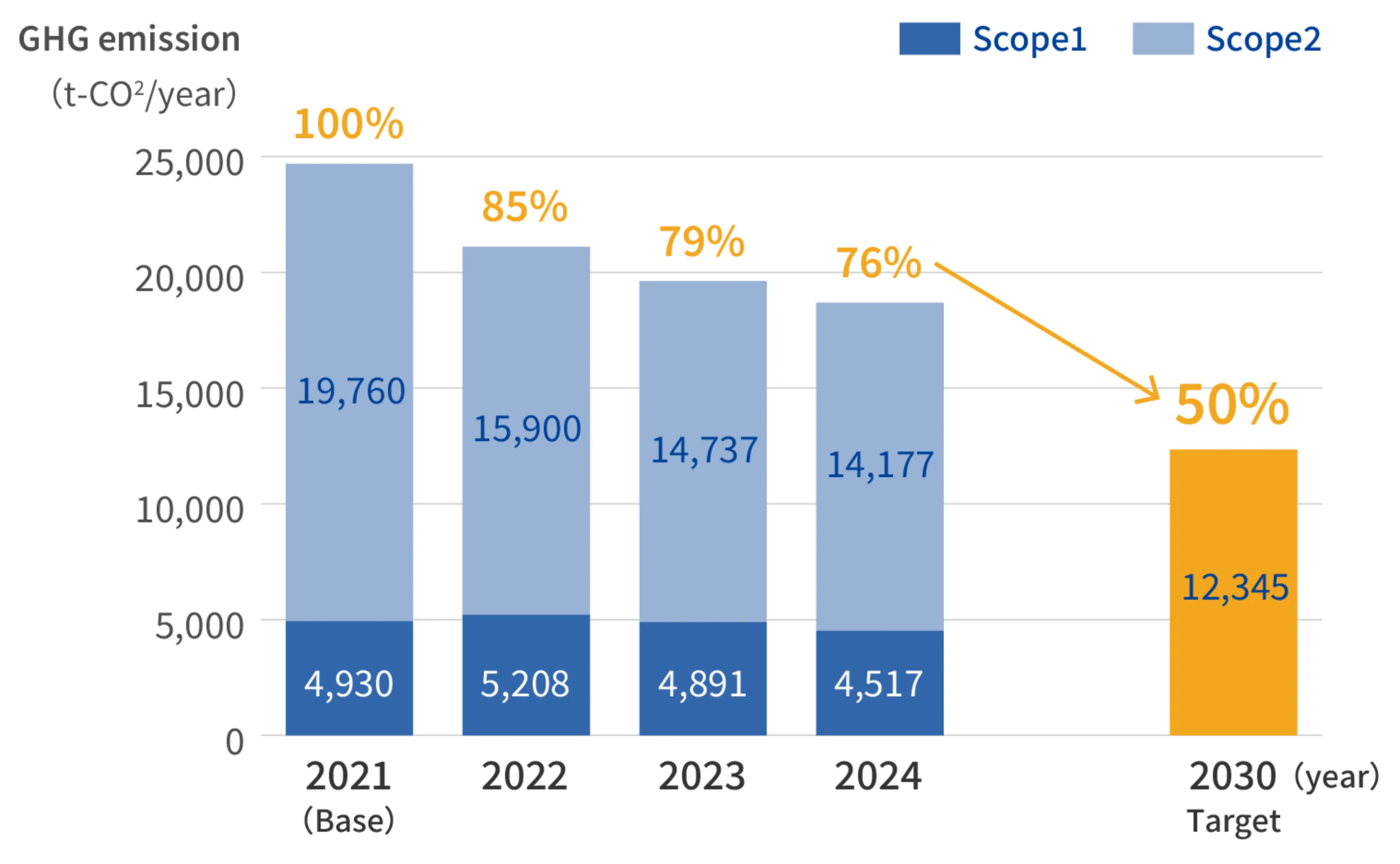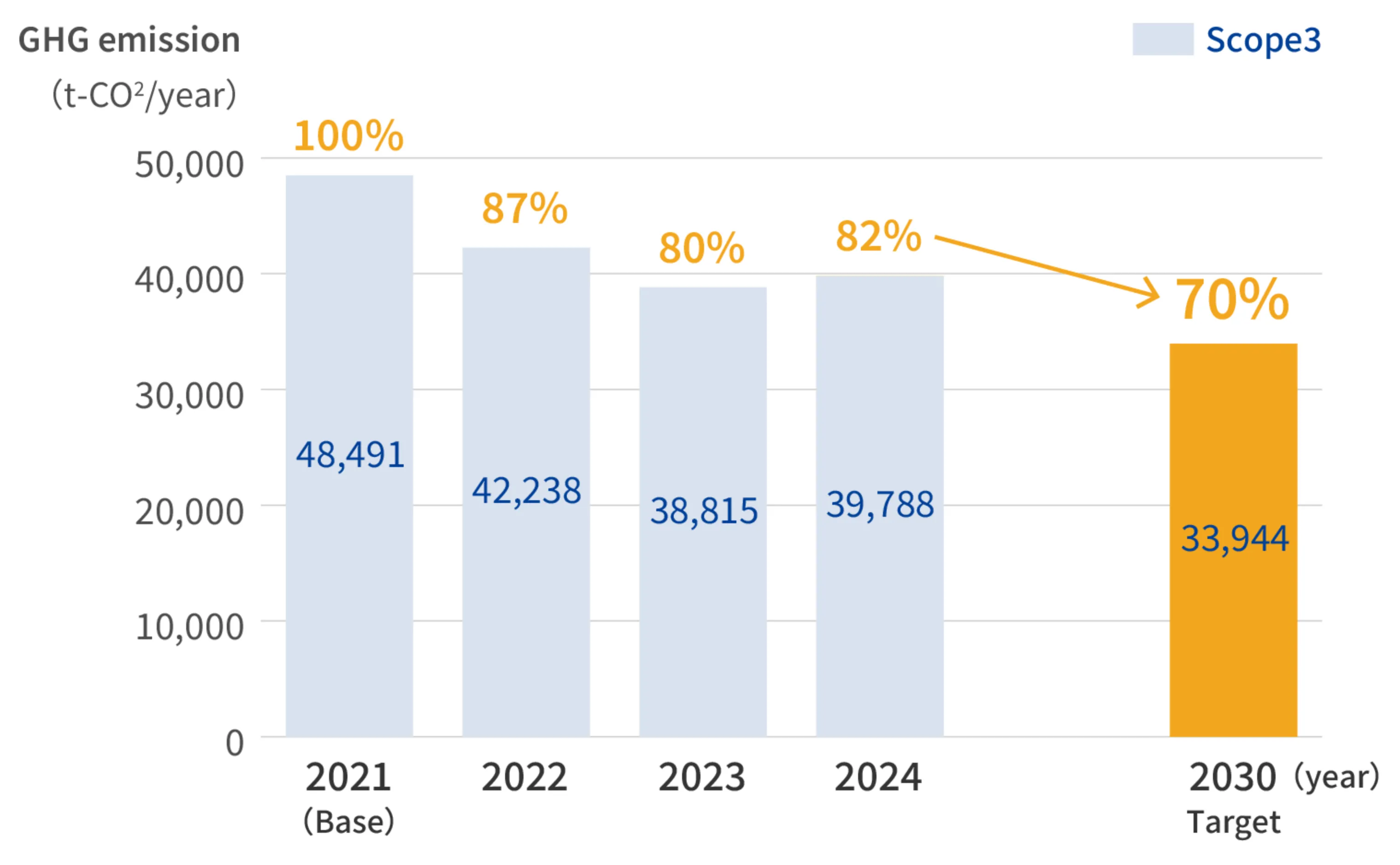 Therefore, we have set specific targets to reduce greenhouse gas emissions, which are the primary cause of global warming, across Scope 1 (direct emissions), Scope 2 (indirect emissions from electricity and other energy sources), and Scope 3 (other indirect emissions such as those from the supply chain), as outlined below. To achieve these goals, we are actively pursuing various initiatives, including improving energy efficiency and introducing renewable energy sources.