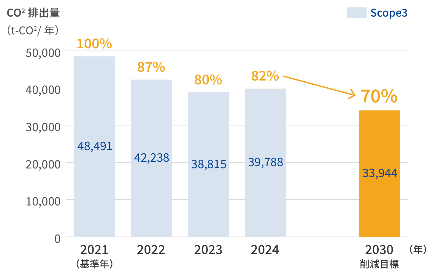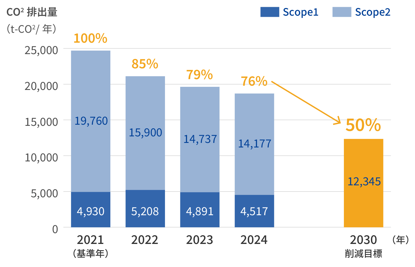 そのため当社は地球温暖化の原因である温室効果ガスの排出の削減に向けて、Scope1(直接排出)、Scope2(電力などの間接排出)、Scope3(サプライチェーンなどのその他間接排出)、それぞれについて以下の通り目標を定め、その達成のためにエネルギー効率の向上や再生可能エネルギーの導入など、様々な取り組みを進めています。